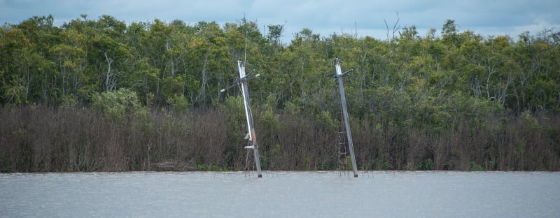 There have been many other memorable incidents in shallow waters. Would I have it any other way? Oh yes! Especially the encounter with Kirby's Wall. The Burnett River was in flood. Just a minor flood according to the official measurements, but it was sufficient to wipe out, or at the very least reposition, all the navigation marks. So in our desperation to get out of the river as soon as possible we left Bundaberg close to the top of the tide. But the current was ripping: we were doing 6 knots without engine or sails. To add to the confusion, our inbound track had been lost due to a computer glitch — we really were winging it in a bad way. Anyway, our speed didn't leave much time for navigation, and in the confusion we sailed over the top of Kirby's Wall. The top of Kirby's Wall is normally a metre or more above the surface but in the flood it was invisible beneath the turbulent brown water. The rudder caught on the top of the solid bluestone structure and we were stuck. The tide went out and despite hauling with kedges and dinghies we were there till the next tide. Now tides in the Burnett then were a frightening 2m or more and we wondered seriously whether we'd survive the intervening low tide. The local VMR assured us it would be fine — lots of boats had been salvaged from the top, or even inside, Kirby's Wall. Very reassuring. It did rather beg the question as to why this wall had not been demolished years ago!